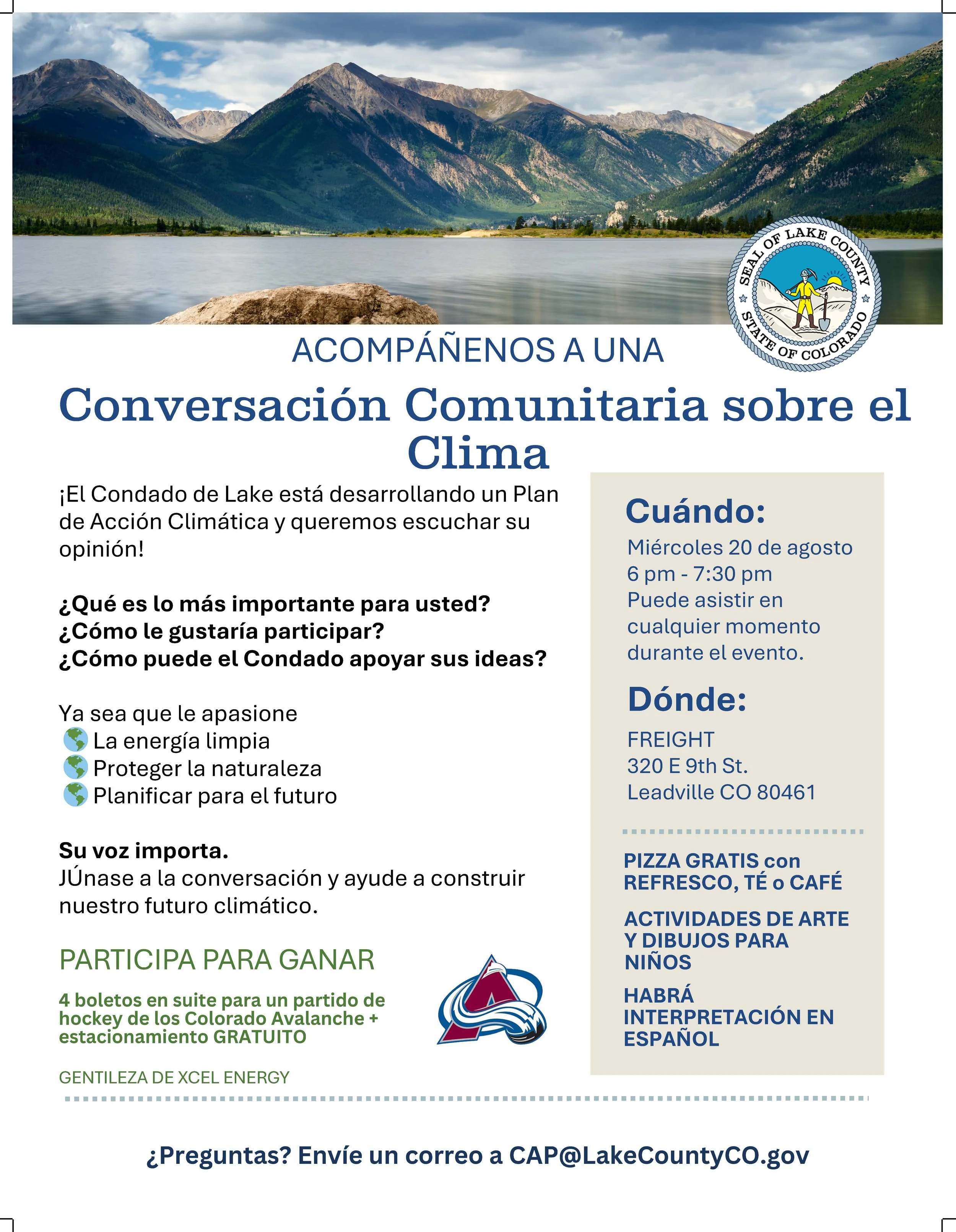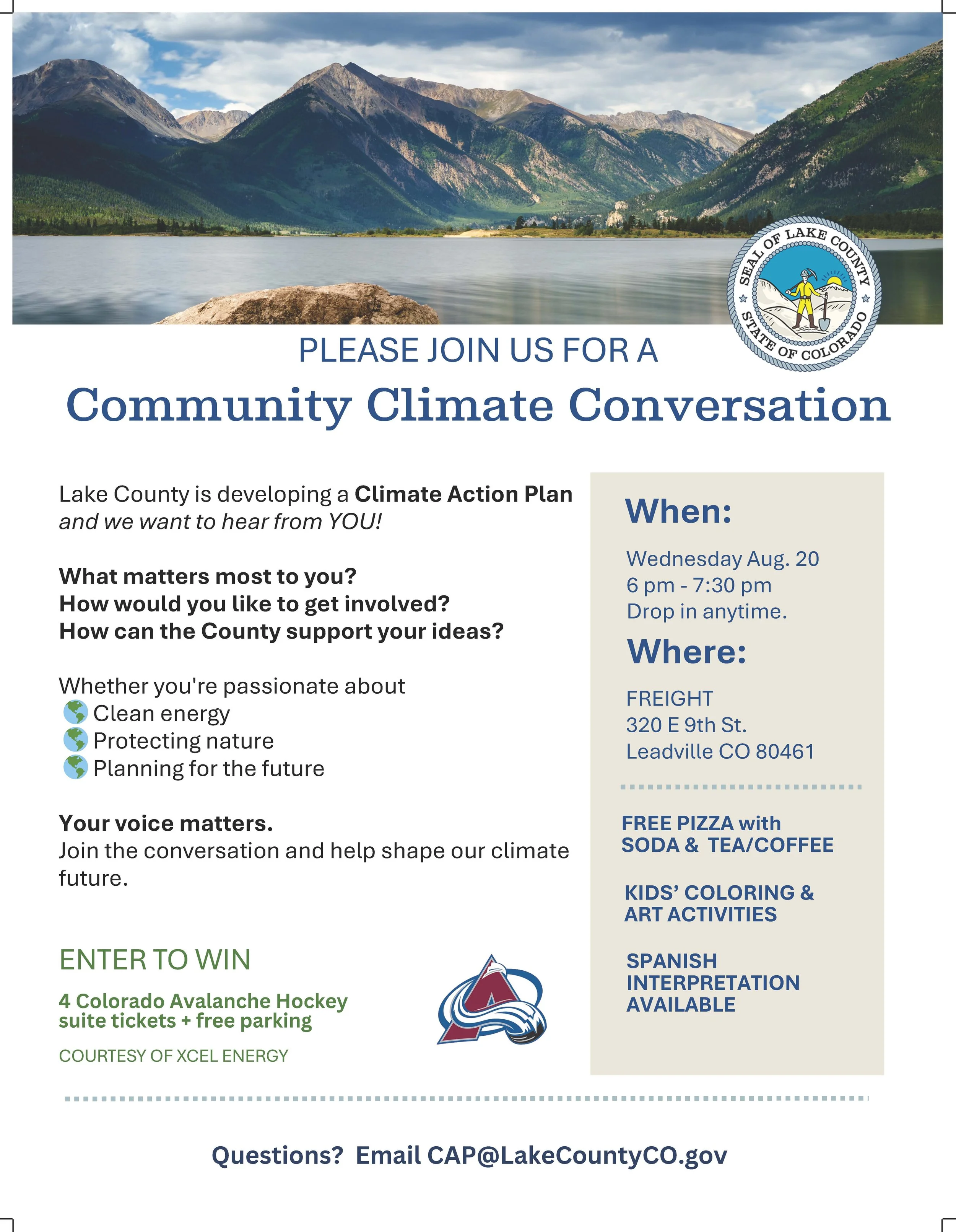 Lake County residents of all ages are invited to a drop-in Community Climate Conversation on Wednesday, August 20, from 6:00–7:30 p.m. at FREIGHT Leadville.