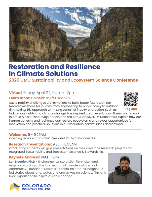 Mark your calendar! Colorado Mountain College is thrilled to host its annual Sustainability & Ecosystem Science Conference on Friday, April 24, 2026, from 9 a.m. to 12 p.m.