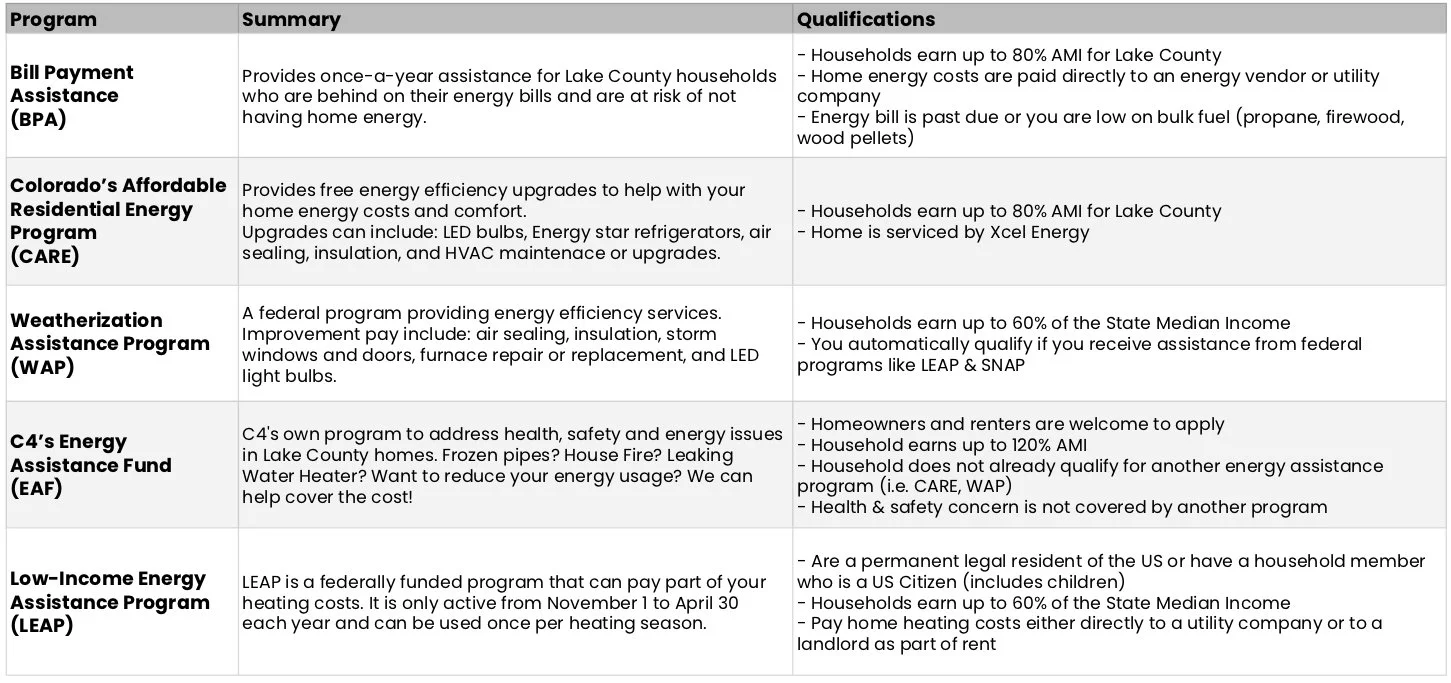 In partnership with Energy Outreach Colorado’s Bill Payment Assistance program C4 provides once-a-year assistance for Lake County households who are behind on their energy bills and are at risk of not having home energy.